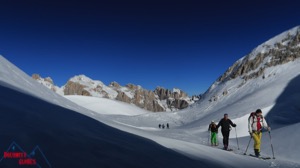 Saliamo con la funivia alla Cima Rosetta m. 2743 da dove parte il nostro itinerario. Con diversi saliscedi ci dirigiamo verso la forcella alta del Ghiacciaio dove tolte le pelli parte la nostra lunga discesa verso il Passo Canali e la Val Canali.
