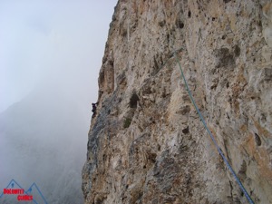 Stupenda ascensione su roccia ottima che supera l'aereo spigolo della Torre Delago.